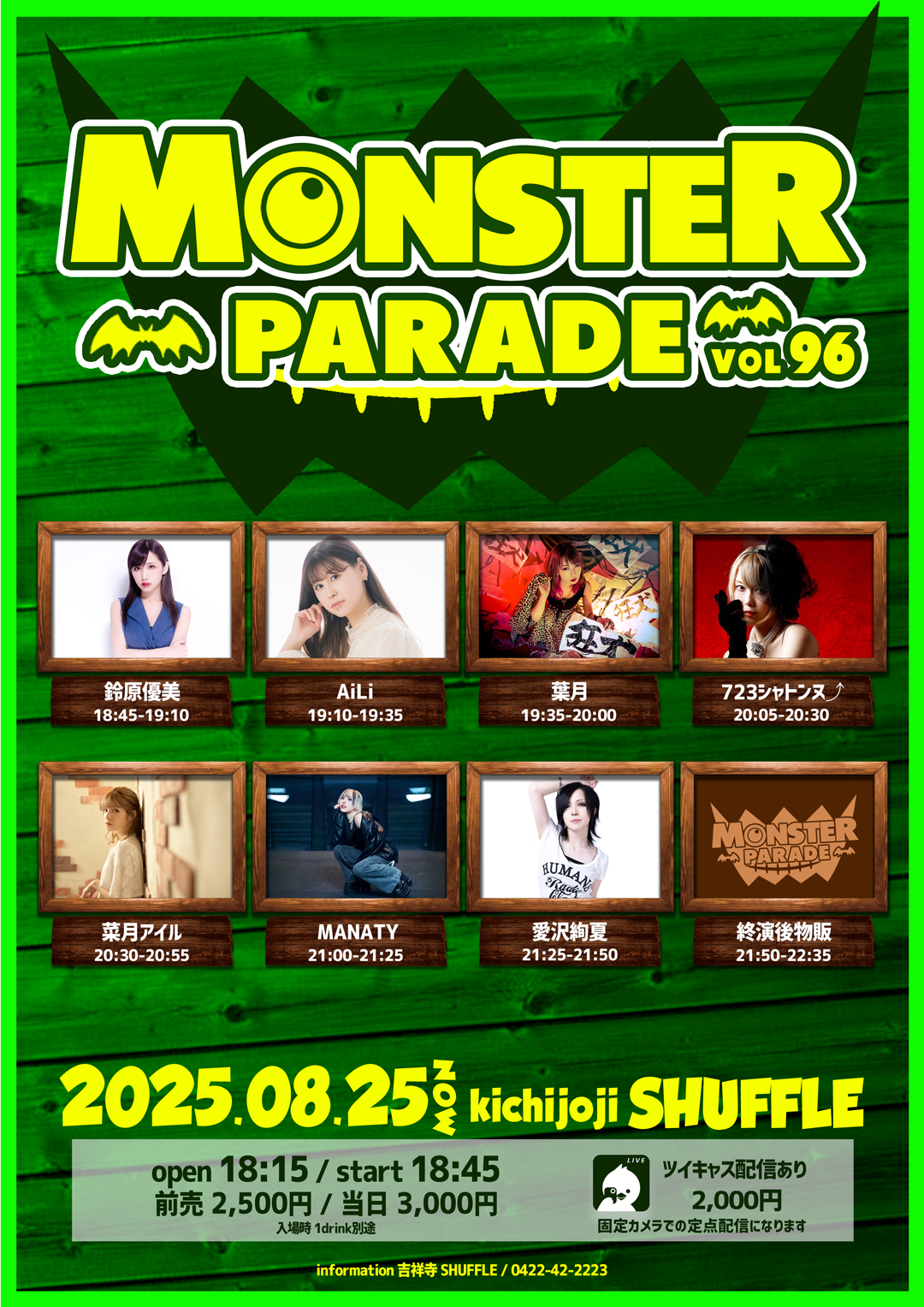 ■08月25日(月) 吉祥寺 SHUFFLE 「MONSTER PARADE vol,96」 【出演】愛沢絢夏 / AiLi / 723シャトンヌ⤴ / MANATY / 菜月アイル / 葉月 / 鈴原優美 […]