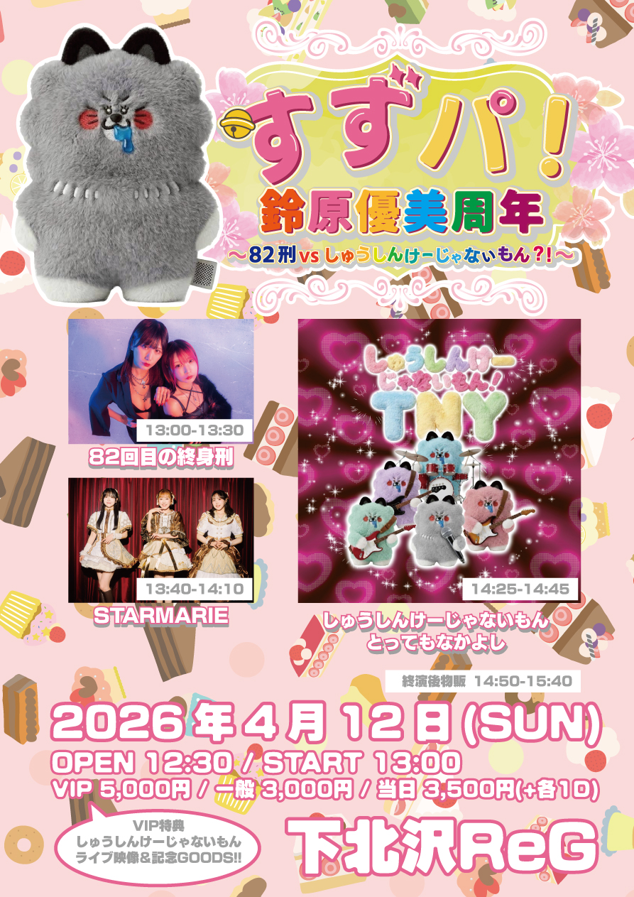 ゆぅみん周年イベント!!!! すずパ!鈴原優美周年 〜82刑vsしゅうしんけーじゃないもん?!〜 日程:2026月4月12日(日) 会場:下北沢ReG 時間:OPEN 12:30 / START 13:00 料金:VIP […]