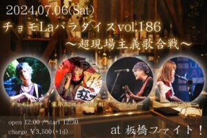 葉月 アコースティックイベント!! このイベントには予約特典があります。 予約特典 メッセージ動画 7/06(土)板橋ファイト! 【チョモLaパラダイスvol.186 〜超現場主義歌合戦〜】 w/ 葉月(82回目の終身刑)、みそたろー、KYOKO open 12:00 / start 12:30 charge ¥3,500(+1order)