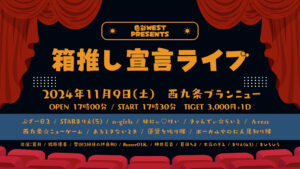 箱推し宣言ライブ2024 日程:2024年11月09日(土) 会場:西九条ブランニュー 時間:OPEN17:00/START17:30 料金:3,000円+1D https://tiget.net/events/354104 販売開始 2024年10月22日 21時~ 出演:葉月 / 鈴原優美 / 雪(82回目の終身刑) / Buzzer01&. / 神井花音 / 夏目ちよ / 木元のぞみ / まりえ(43) / まひろひろ 限定ユニット: ぶざー82 / STARまりえ(5) / n-girls / はにぃ♡けい / きゃんでぃ☆らいと / 西九条☆ニューゲーム / あるときないとき / Λress / 運営を叱り隊 / ボーカルやのに人見知り隊 ☆色彩WESTの大人気イベント!! 当日限定ユニットによるコラボコーナー、トークコーナー、所属の枠を超えたまるっと箱推しイベント☆ ☆限定ユニット ランダムチェキ / 缶バッジあり!! ☆最初から最後までノンストップで楽しもう!! 【メンバー紹介】 ぶざー82・・・82刑メンバー / Buzzer01&.メンバー STARまりえ(5)・・・葉月 / まりえ(43) / 木元のぞみ / 夏目ちよ / まひろひろ n-girls・・・hazuki / yumi / mahirohiro / marie(43) / nozomi はにぃ♡けい・・・葉月 / 鈴原優美 / 雪 きゃんでぃ☆らいと・・・はづきちゃん(8) / おちよちゃん(12) 西九条☆ニューゲーム・・・鈴原優美 / まひろひろ / 夏目ちよ / 木元のぞみ あるときないとき・・・鈴原優美(ある方) / 神井花音(ない方) Λress・・・神井花音 / まりえ(43) / 木元のぞみ 運営をり隊・・・鈴原優美(色彩WEST) / 真琴(King zeebra) ボーカルやのに人見知り隊・・・葉月 / セナ