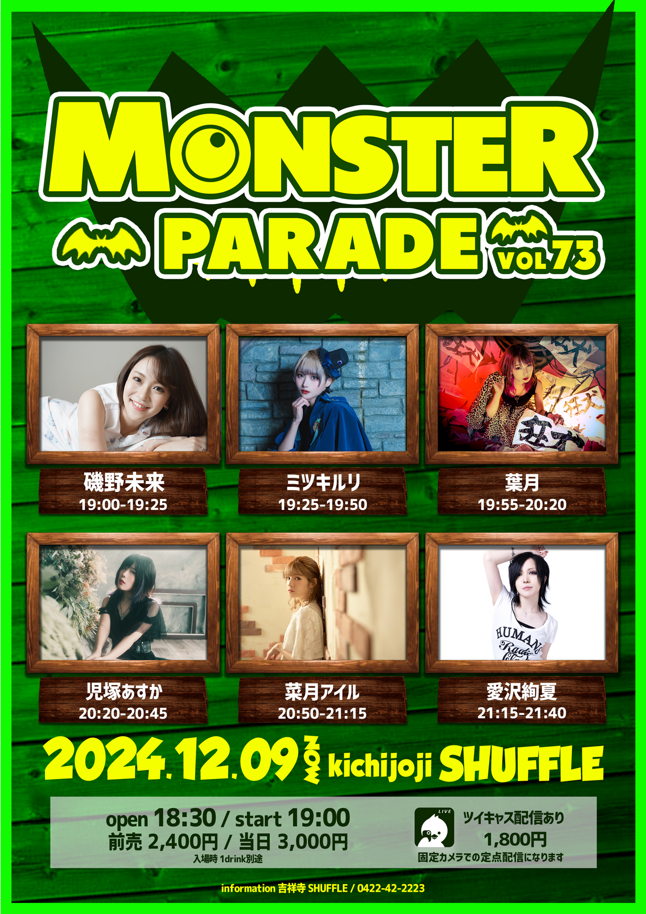 このイベントには予約特典があります。 予約特典 【葉月】100HZK 紙幣の使い方・特典情報まとめはこちらhttps://shikisairecords-west.com/1885 ■12月09日(月) 吉祥寺 SHUFFLE 「MONSTER PARADE vol,73」 【出演】愛沢絢夏(ASH FRAST) / 菜月アイル / 磯野未来 / ミツキルリ / 児塚あすか / 葉月 【時間】開場 18:30 / 開演 19:00 【料金】前売 2,400円 / 当日 3,000円(+1D) 【入場順】整理番号順 【チケット】TIGET(11月11日 22:00~) https://tiget.net/events/359132 【配信】1,800円(アーカイブ1週間) https://twitcasting.tv/k_shuffle/shopcart/342902 ※配信は定点カメラの映像になります。 【問い合わせ】吉祥寺 SHUFFLE / 0422-42-2223
