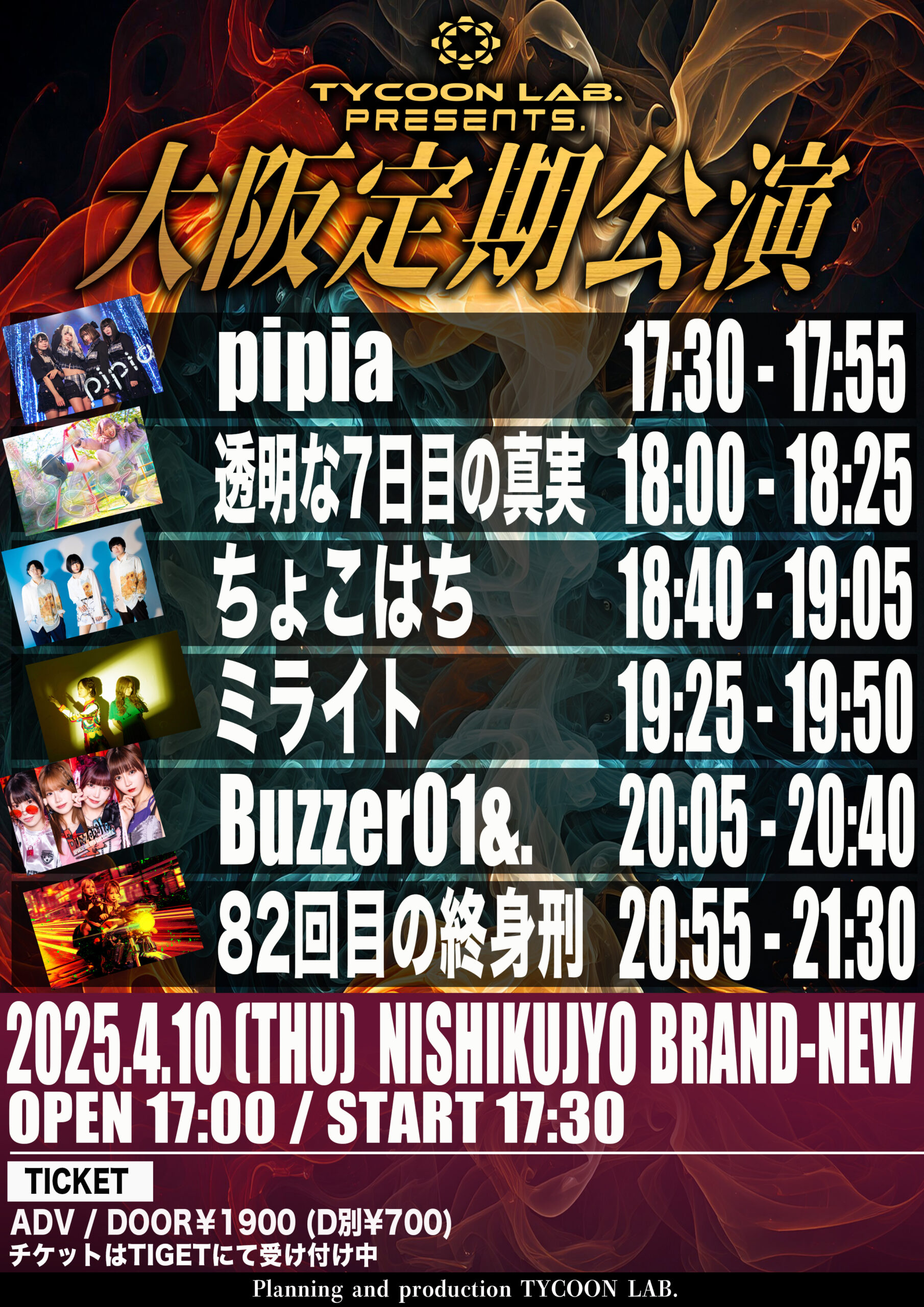 タイラボ定期S__23167036S__23756819●日程: 2025/4/10(木) 西九条BRAND-NEW TYCOON LAB.presents 大阪定期公演 【CAST】 ・Buzzer01&. ・82回目の終身刑 ・ちょこはち ・ミライト ・pipia ・透明な7日目の真実 OPEN 17:00 / START 17:30 (予定) ADV / DOOR¥1900 (D別¥700) ◉チケット受け付けURL https://tiget.net/events/386730