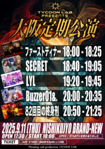 ●日程: 2025/9/11(木) 西九条BRAND-NEW TYCOON LAB. presents.大阪定期公演 【CAST】 ・Buzzer01&. ・82回目の終身刑 ・LYL ・ファーストディナー ・SECRET OPEN 17:30 / START 18:00 ADV ¥1900 / DOOR¥2400 (D別¥700) -------------------------- ◉チケット受け付けURL https://tiget.net/events/420396 ----------------------------------------------------