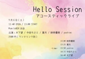 葉月/鈴原優美 アコースティックにて出演!9月6日(土) Hello Session 12:40 OPEN / 13:00 START MsmileBOX渋谷 出演:木下望 / 中田ちさと / 葉月 / 鈴原優美 / yoshimi ¥2500(ワンドリンク別) https://tiget.net/events/423823 8/22 21:00予約開始 12:40 OPEN 13:00-13:20 鈴原優美 13:25-13:45 葉月 13:50-14:10 yoshimi 14:15-14:35 中田ちさと 14:40-15:00 木下望