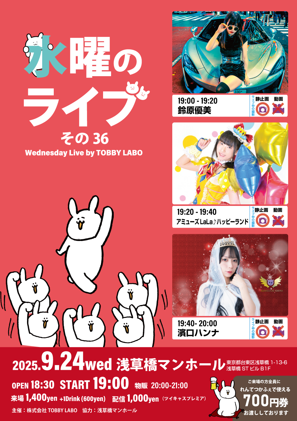 鈴原優美出演! このイベントには予約特典があります。 メッセージ動画『水曜のライブ その36』 日程:2025年9月24日(水) 会場:浅草橋マンホール 時間:OPEN 18:30/ START 19:00/ CLOSE 21:00 物販:20:00-21:00 料金:一律 1,400円 (別途1D600円) 来場予約(TIGET)https://tiget.net/events/422447 配信:1,000円 (ツイキャスプレミアにて配信) 配信(ツイキャスプレミア) https://premier.twitcasting.tv/wedlivetl/shopcart/391006 ご出演(敬称略) 鈴原優美/アミューズLaLa♪ハッピーランド/濱口ハンナ(れん てつ)