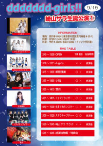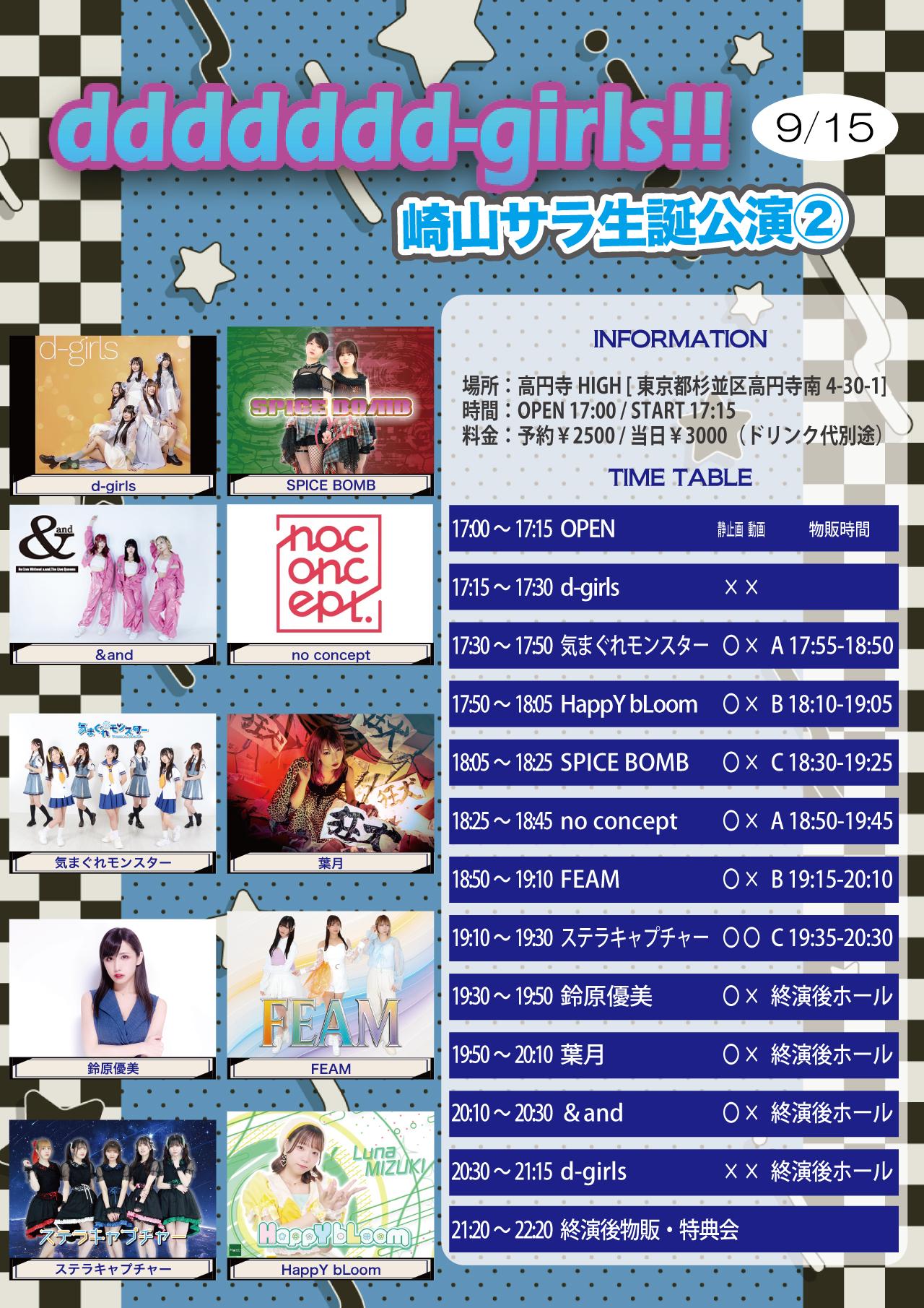 ddddddd-girls!!~﨑山サラ生誕公演①~ 9/15(月祝) 場所:高円寺HIGH [東京都杉並区高円寺南4-30-1] 時間:OPEN 12:40/START 13:00 料金:前売¥2500/当日¥3000(ドリンク代別途) 出演:﨑山サラ / d-girls / 葉月 / 鈴原優美 / 小粒 / アイアイタイガー / 気まぐれモンスター / ステラキャプチャー 予約 https://tiget.net/events/427074 <入場順> ・TIGET予約番号順 ・当日券整列順ddddddd-girls!!~﨑山サラ生誕公演②~ 9/15(月祝) 場所:高円寺HIGH [東京都杉並区高円寺南4-30-1] 時間:OPEN 17:00/START 17:15 料金:前売¥2500/当日¥3000(ドリンク代別途) 出演:d-girls / &and / 気まぐれモンスター / 鈴原優美 / ステラキャプチャー / SPICE BOMB / 葉月 / FEAM / HappY bLoom / no concept ほか 予約 https://tiget.net/events/427077 <入場順> ・TIGET予約番号順 ・当日券整列順